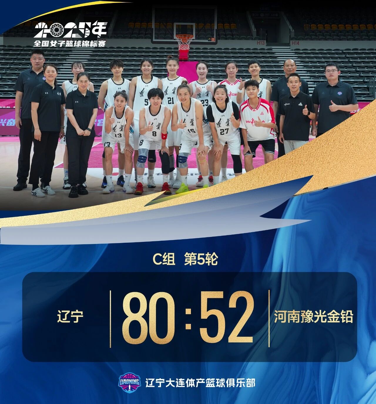 北京时间2025年9月21日19时30分,2025年全国女子篮球锦标赛浙江诸暨赛区第五轮,辽宁队迎战河南豫光金铅女篮。全场比赛,辽宁队攻防两端表现稳健,从第二节开始确立领先优势,最终80:52战胜对手。辽宁队以四胜一负的佳绩位列小组第二名,成功晋级全国锦标赛决赛阶段!