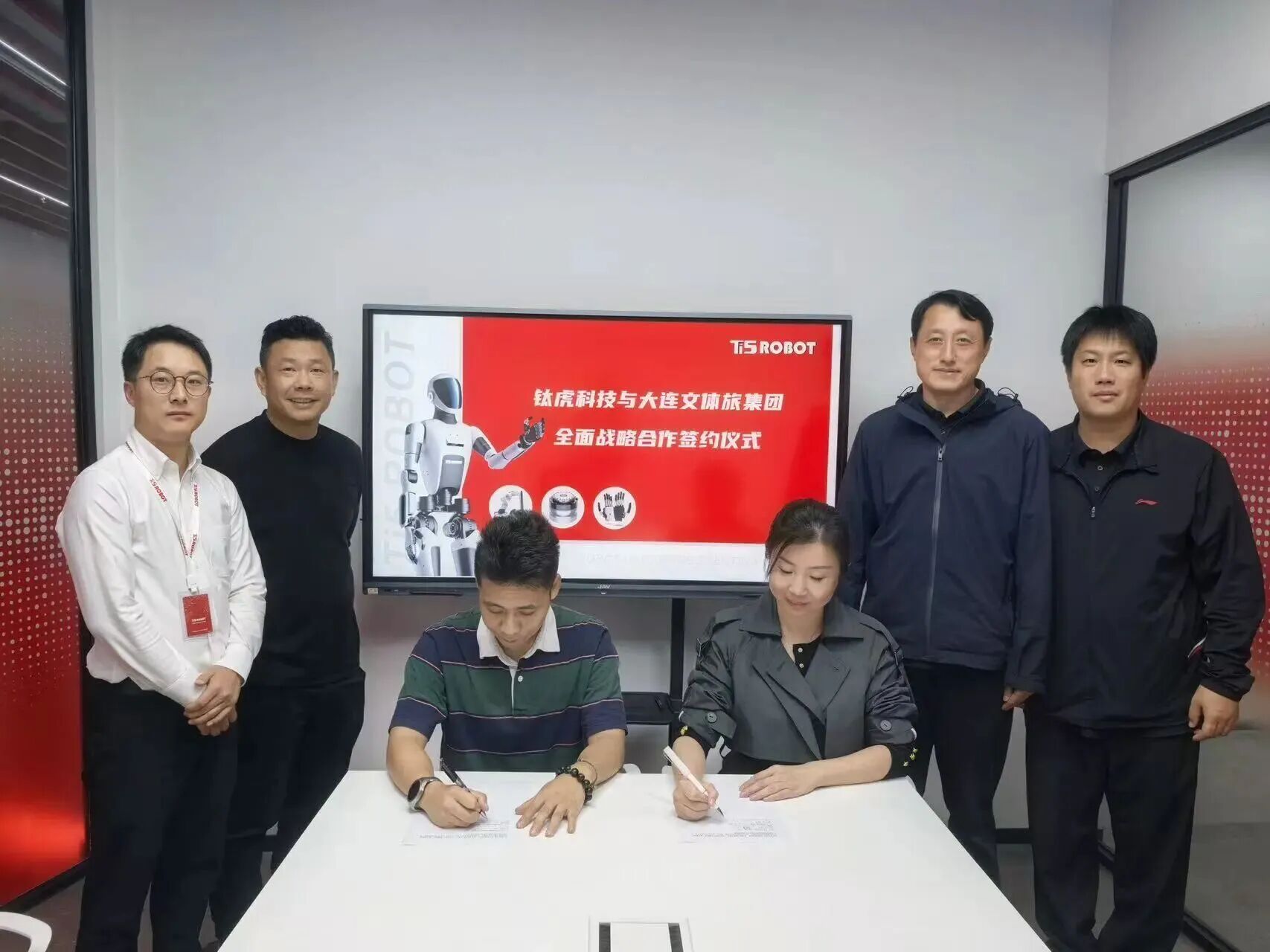 10月20日,大连文体旅集团与钛虎机器人科技(上海)有限公司在上海钛虎科技总部签署全面战略合作协议,双方响应大连市“十四五”文旅产业规划中“智慧文旅”建设要求及智慧城市发展战略,通过资源共享、能力互补,共同打造“科技+文体旅”融合发展典范。继大连市政府领导与钛虎科技代表举行工作会谈后,大连文体旅集团积极落实会谈精神,加速推进实体项目落地。大连文体旅集团党委副书记、董事、总经理孙爽,副总经理张智,钛虎机器人科技(上海)有限公司总裁李永超出席。