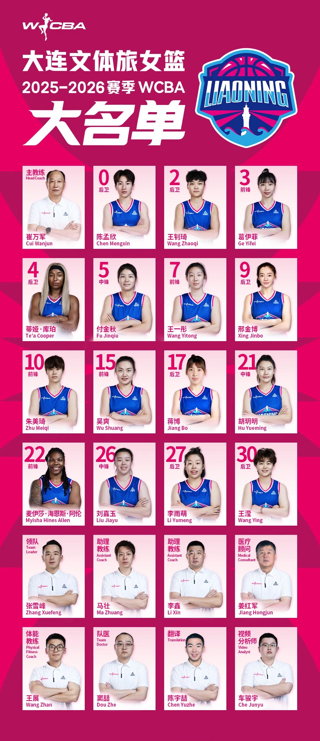近日,我俱乐部已将新赛季大连文体旅女篮球员完整注册材料报送至中国篮协审核,现公示15人球员及教练组名单如下!