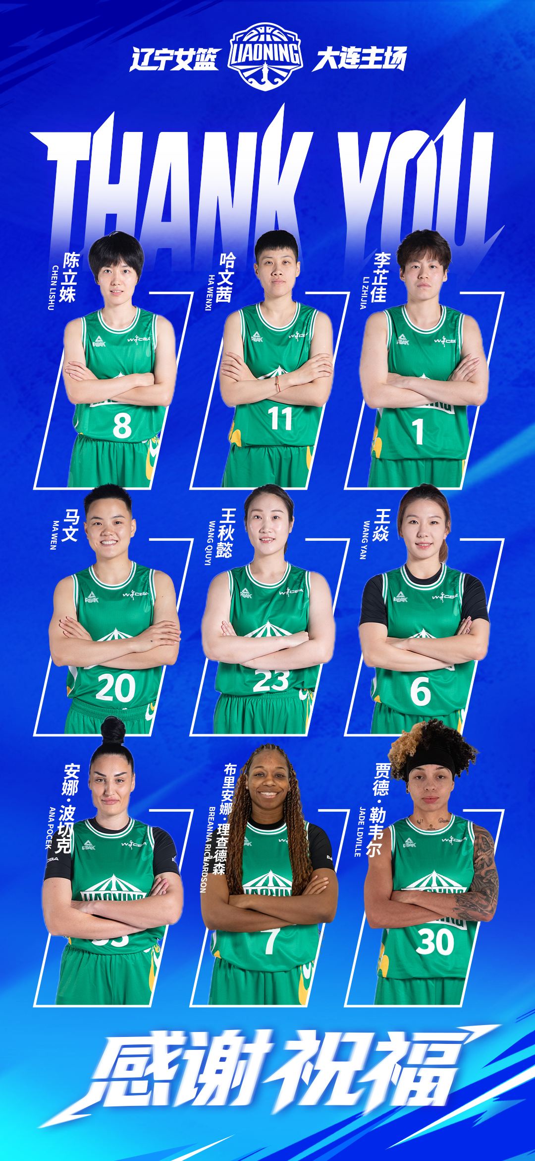 衷心感谢陈立姝、王焱、哈文茜、马文、王秋懿、李芷佳、安娜·波切克、布里安娜·理查德森、贾德·勒韦尔等球员上赛季为球队付出的努力与贡献!